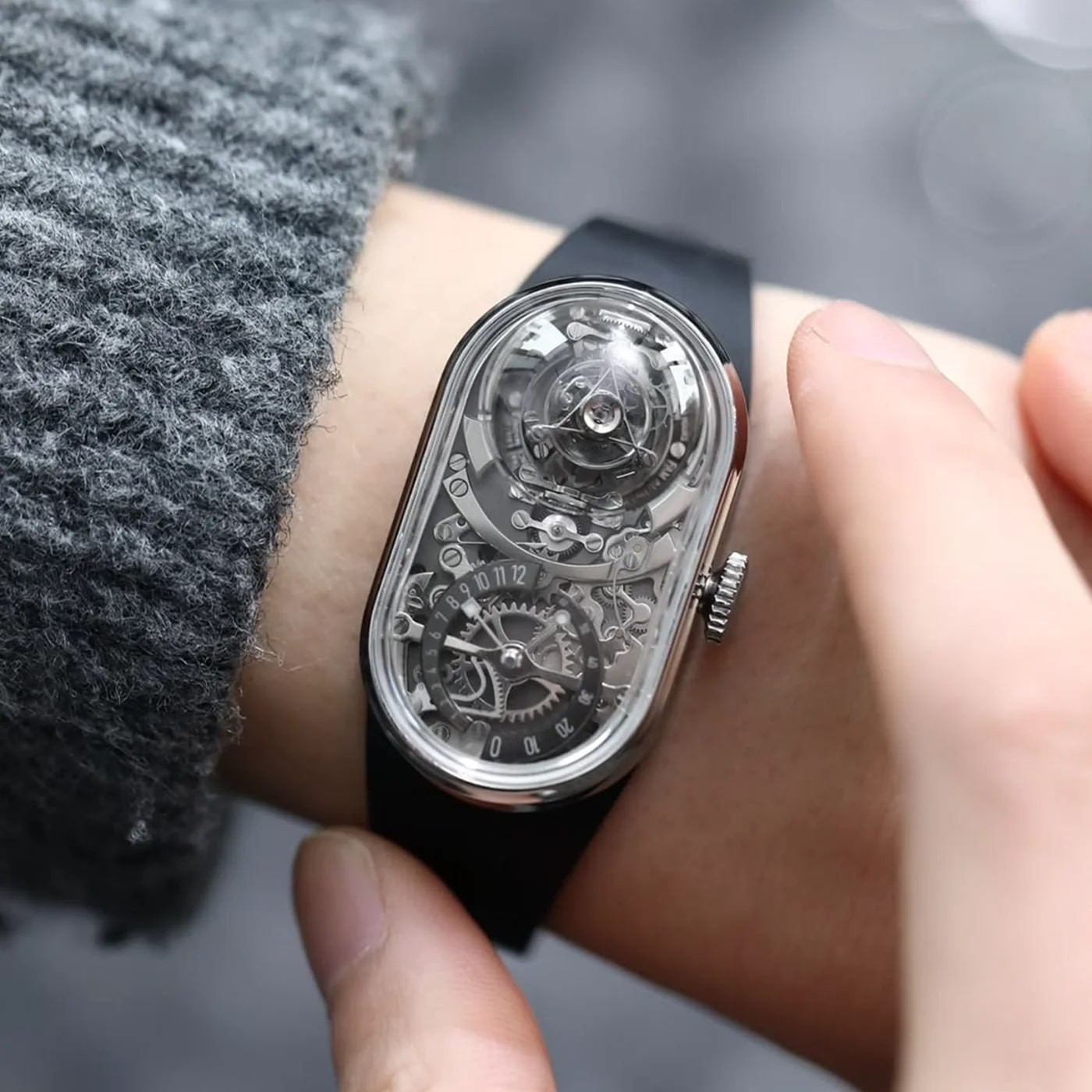 Помимо турбийона механизм часов поддерживает ретроградную индикацию минут и ретроградную индикацию прыгающего часа. Носить часы предлагается на каучуковом ремешке. Ориентировочная стоимость модели составляет CHF 26,620.