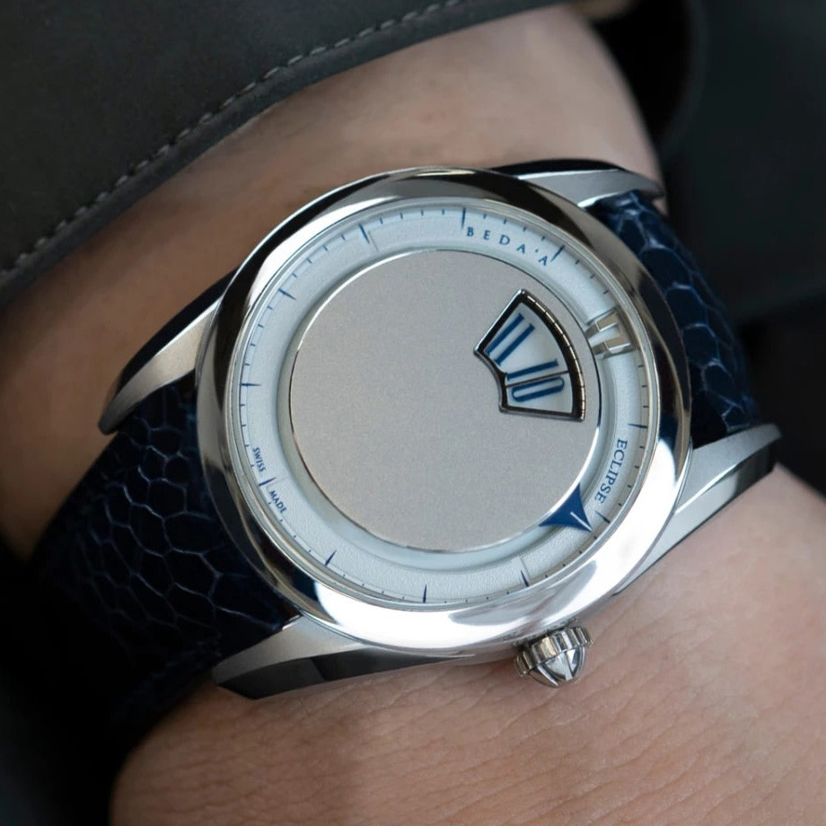 Дизайн этих часов вдохновлен затмением – солнечным или лунным не уточняется. Стальная пластина в центре циферблата выполняет функцию затмевающего небесного: в ней просматривается окошко с индикацией текущего часа. Выглядывающий из-под пластины индикатор минут явно отсылает к лучам того светила, которое затмили.