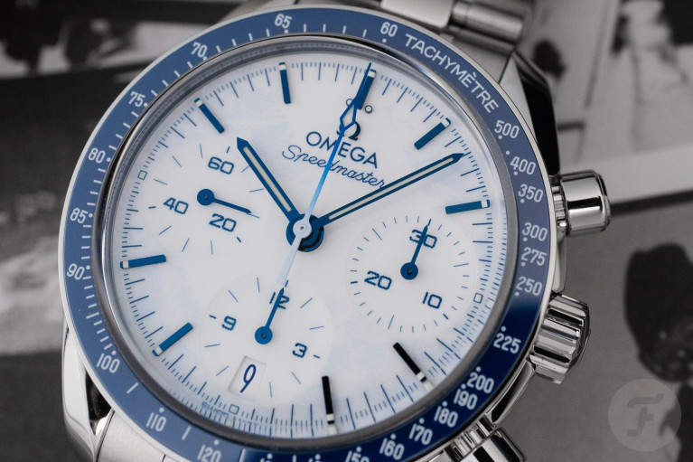 Также можно заметить, что счетчики хронографа на циферблате имеют не овальную, как у стандартных моделей Speedmaster 38, а круглую форму. Часовые метки и все стрелки на циферблате синего цвета. Чуть выпадает их этой схемы центральная секундная стрелка хронографа: ее обыграли эффектным градиентом от голубовато-белого до синего цветов. Заднюю крышку украшает тисненый логотип Олимпийских игр Milano Cortina 2026.