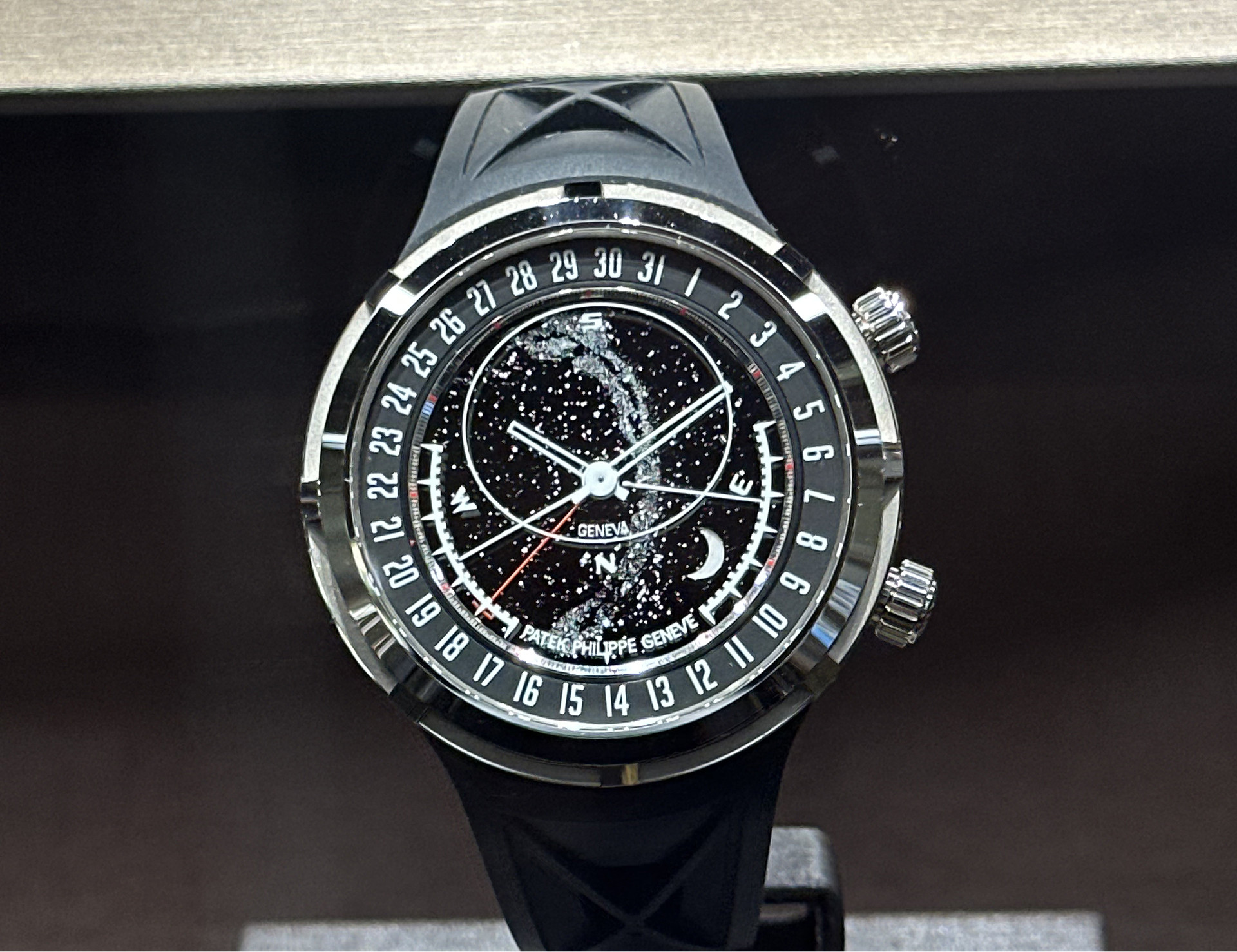 Циферблат у модели многослойный. Он состоит из нескольких сапфировых дисков, которые расположены один над другим и вращаются независимо друг от друга, отображая ночное небо с видимым движением звезд. Оговоримся: на часах отображается фрагмент небесной сферы, видимый над Женевой, а также фазы и орбита Луны.