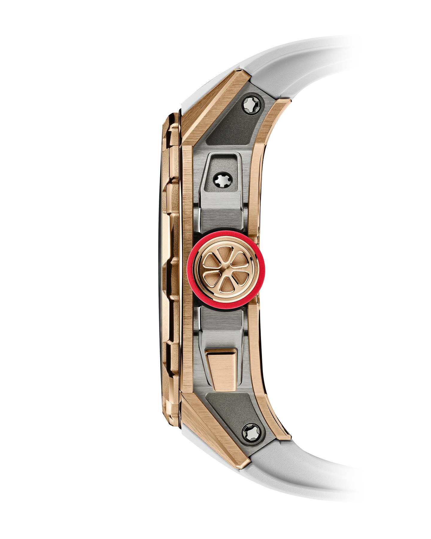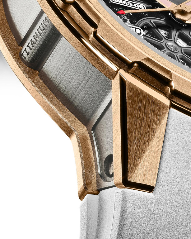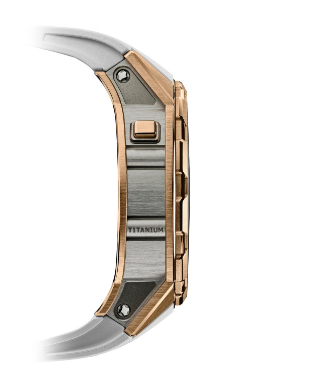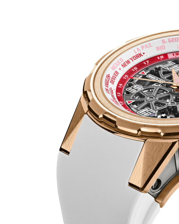 Безель изготовлен из красного золота 5N с пескоструйной обработкой и установлен на шарикоподшипники. Чтобы настроить механизм часов на нужный город, а значит, и на нужный часовой пояс, достаточно повернуть безель таким образом, чтобы название конкретного города совместилось с отметкой «12 часов». Чтение времени осуществляется по 24-часовой шкале, которая вынесена на титановый внутренний безель.