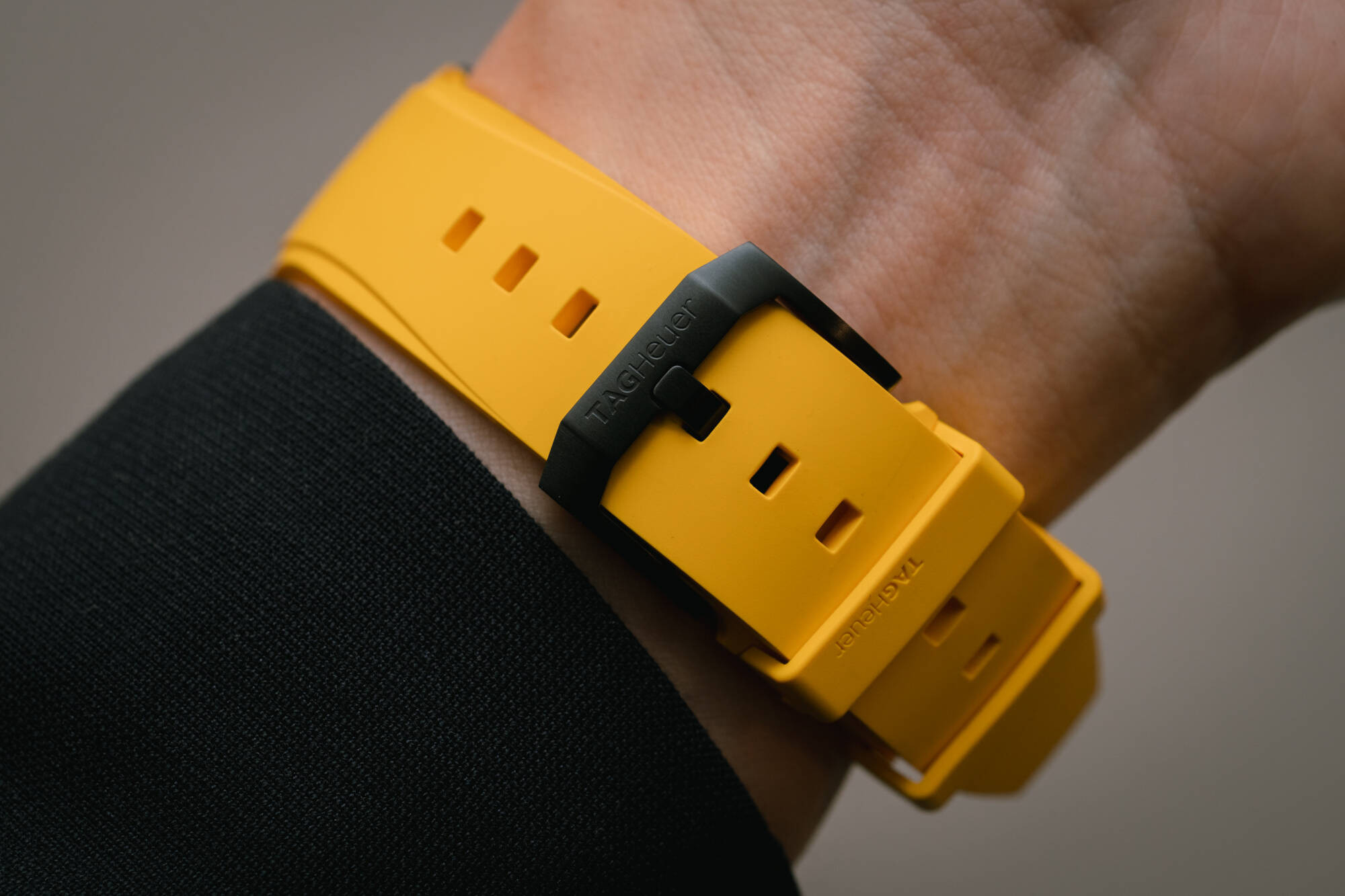 Положение у отметки «3 часа» занимает указатель даты, прижатый к краю логотипом TAG Heuer в виде щита. Покрытая лаком центральная секундная стрелка хронографа выдержана в желтом цвете, что делает композицию циферблата законченной и при этом не перегружает часы визуально.