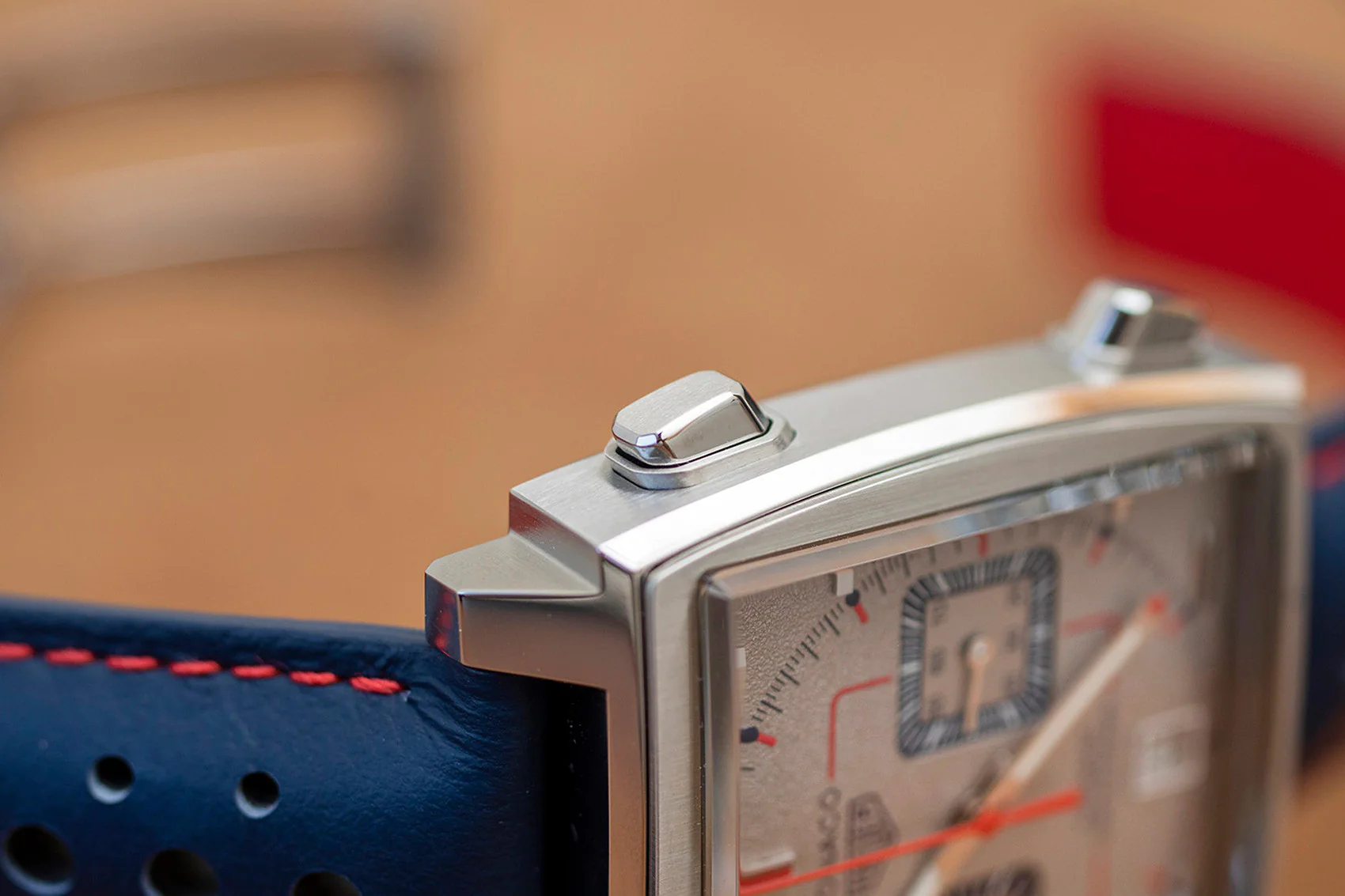 Как и предыдущие две модели, модель Monaco 1989-1999 Limited Edition базируется на дизайне «Steve McQueen» Monaco ref. CAW211P с поправкой на другой цвет ремешка и циферблата. Это означает, что перед нами снова классический стальной корпус (квадрат 39 х 39 мм) с матовыми и полированными поверхностями, сапфировое стекло со стороны циферблата и «неправильная» заводная головка с левой стороны корпуса – без этого Monaco будет уже не Monaco.