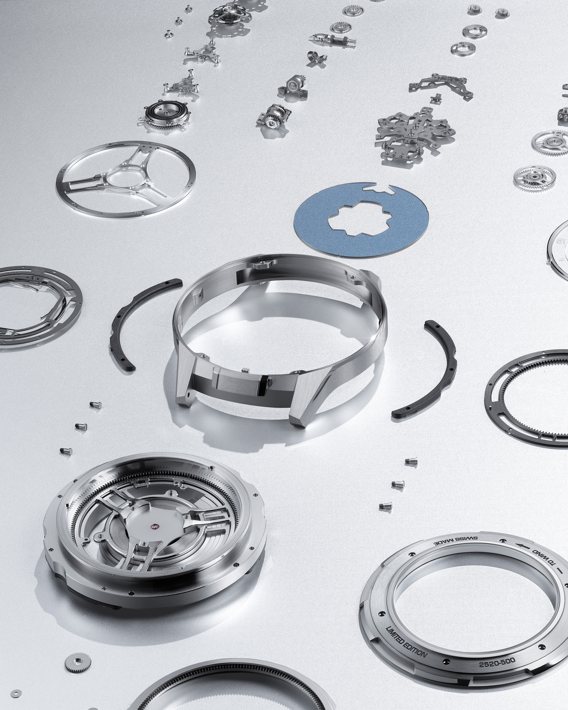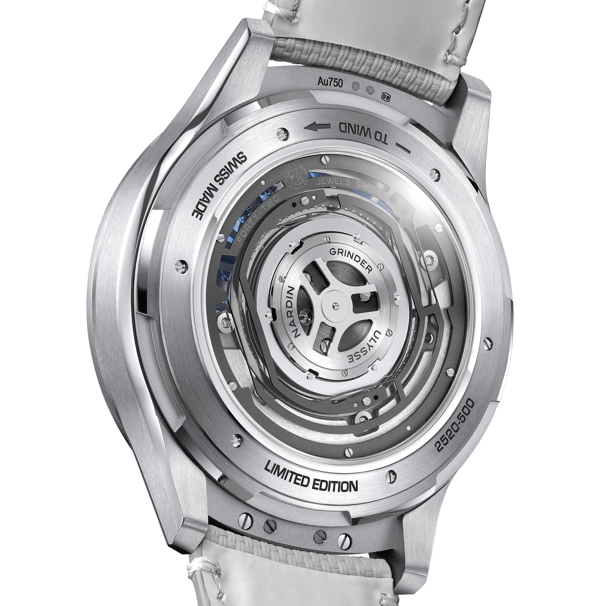 Всю эту сложную конструкцию снабжает энергией запатентованная система автоподзавода Grinder. Здесь нет привычного центрального ротора. Вместо него использована система ультратонкий лезвий, которые соединены с сектором автоподзавода. Такая конфигурация позволяет улавливать малейшие движения запястья и преобразовывать их в энергию для работы механизма, обеспечивая до 3 дней запаса хода.