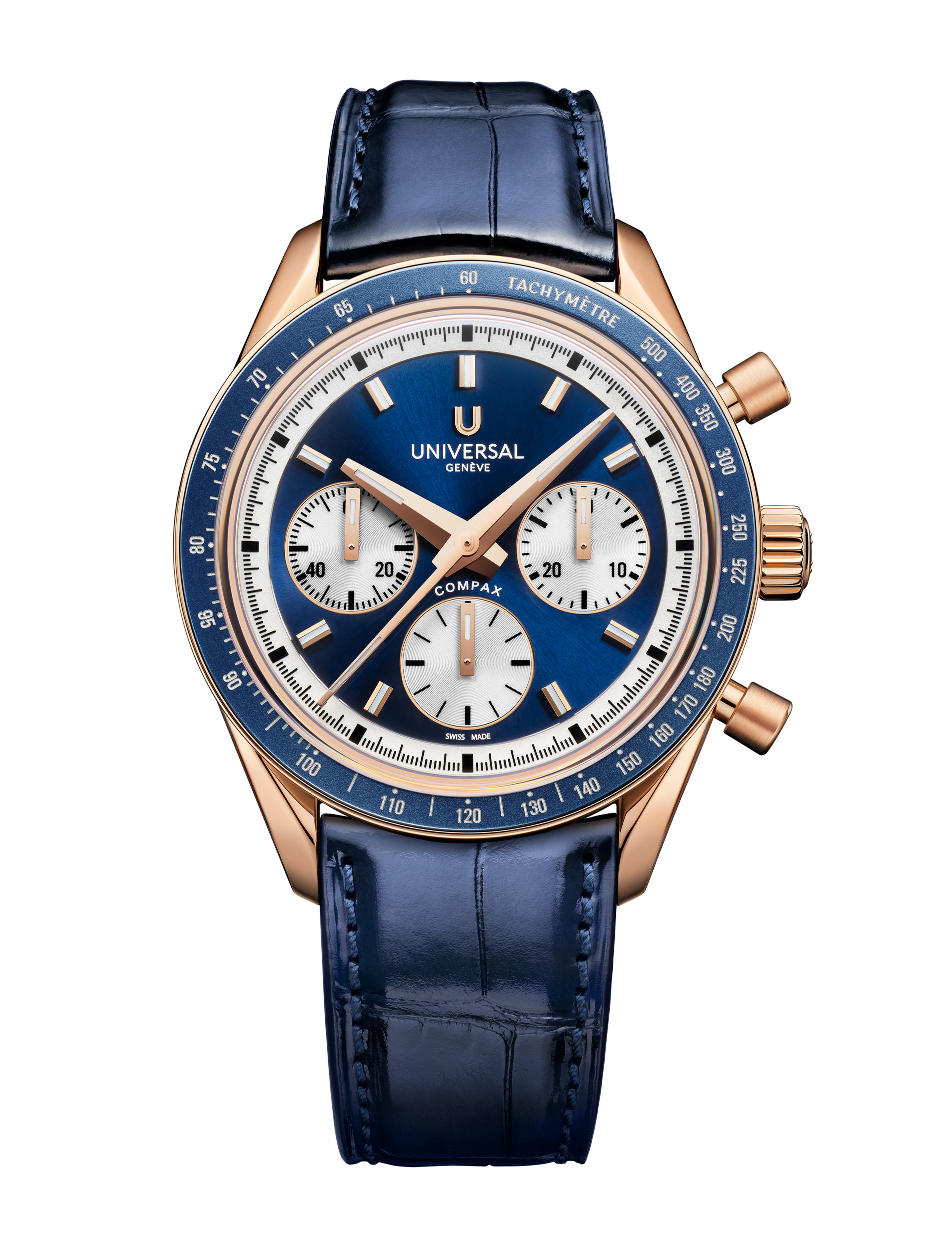 Третьей моделью в серии Compax Prêt-à-Porter стали часы с корпусом из розового золота, синим циферблатом и синим кожаным ремешком. Вся тройка снабжена корпусами 39,5 х 12,45 мм с расстоянием от ушка до ушка 47,8 мм. Безель в часах керамический.