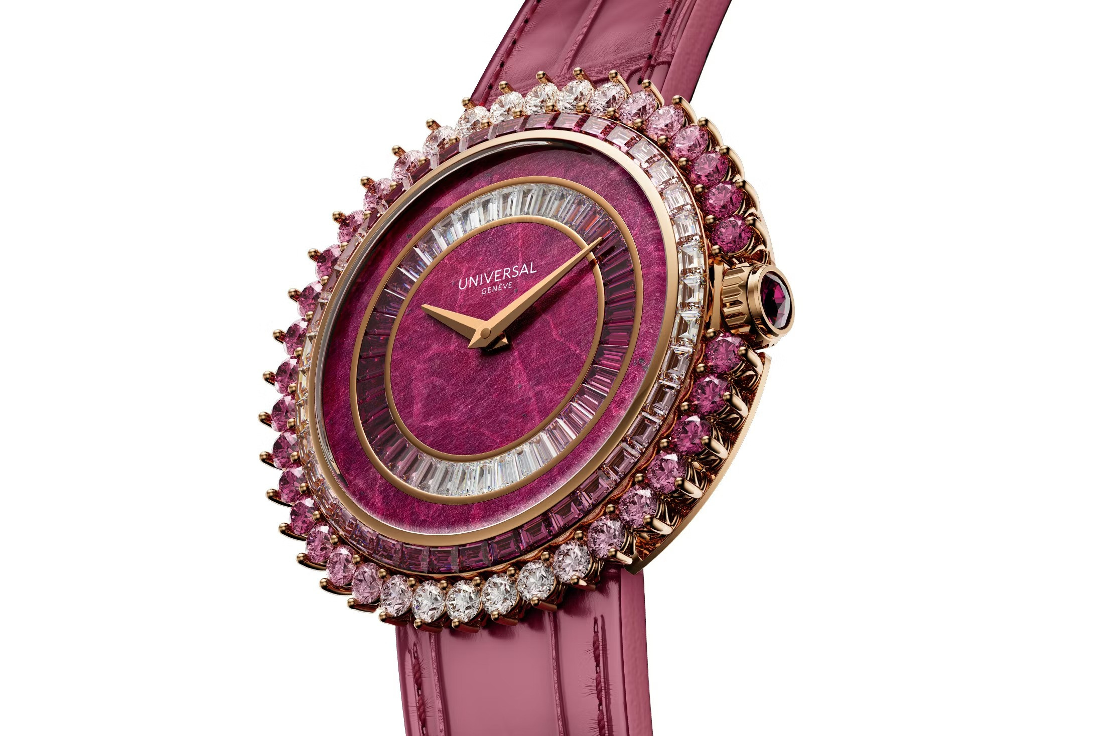 Завершают картинку безель с цепочкой из 38 розовых сапфиров бриллиантовой огранки и ремешок из кожи аллигатора в тон циферблату. Работу модели обеспечивает калибр UG-110 – механизм с микроротором, который гарантирует 72-часовой запас хода. Ориентировочная стоимость часов составляет CHF 150,000.