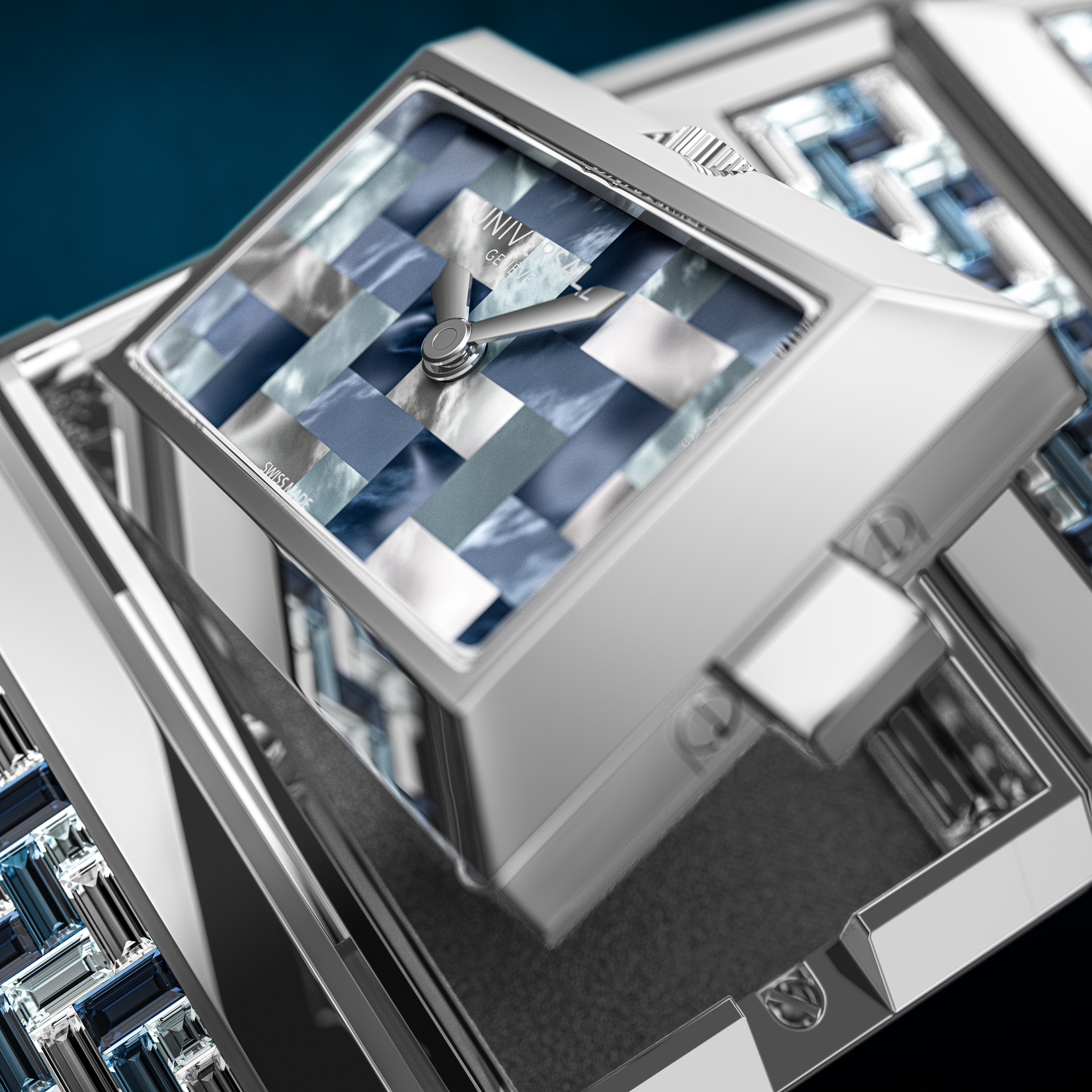Модель Mini Cabriolet Couture Edition единственная в коллекции выдержана в стиле ар-деко, т.е. черпает вдохновение в 1930-х годах. И циферблат, и каждая секция браслета здесь украшены мотивом «елочка». В случае с циферблатом он выполнен в разных оттенках перламутра. В случае с браслетом выложен белыми бриллиантами, а также синим и голубыми сапфирами багетной огранки.