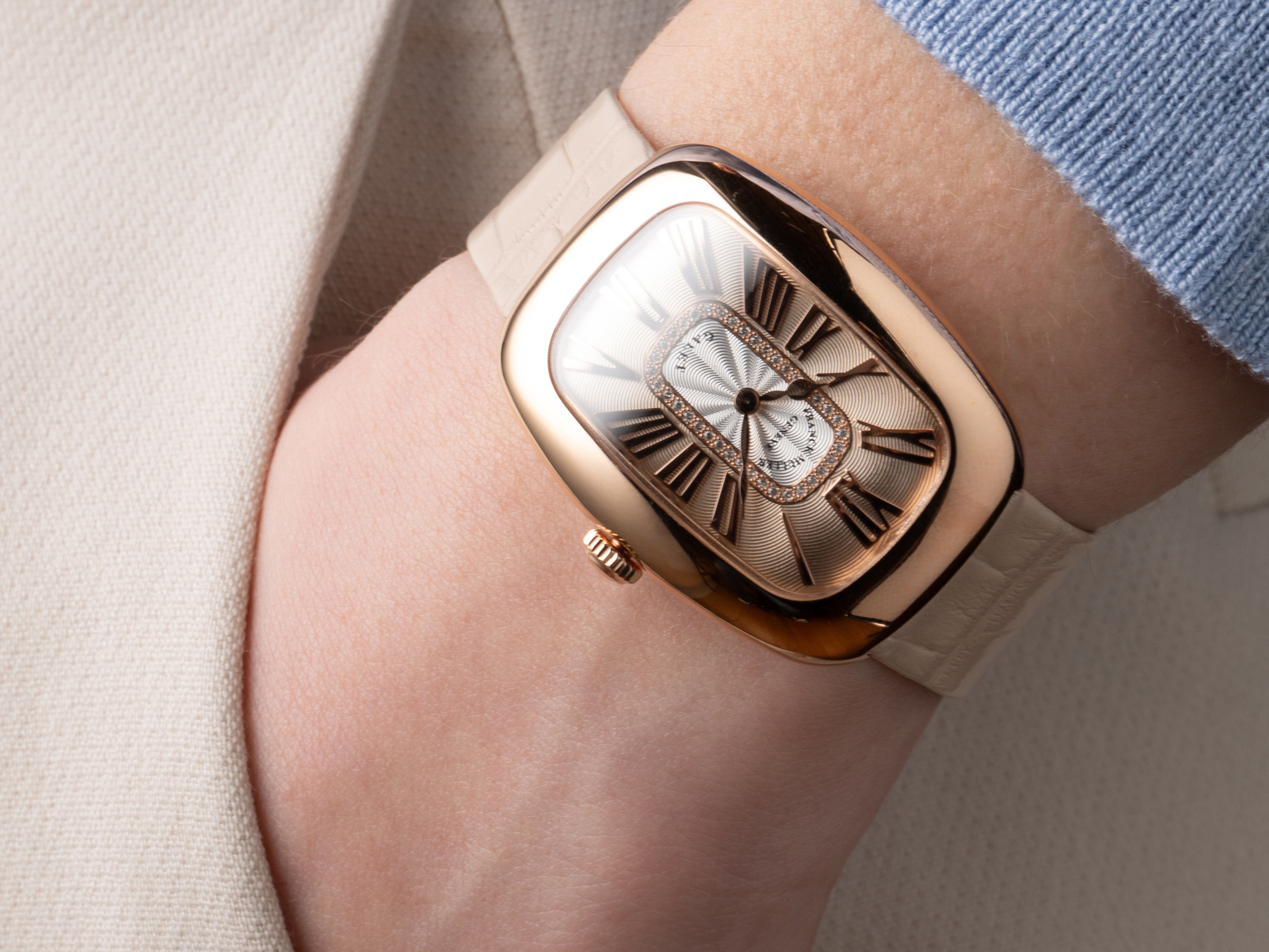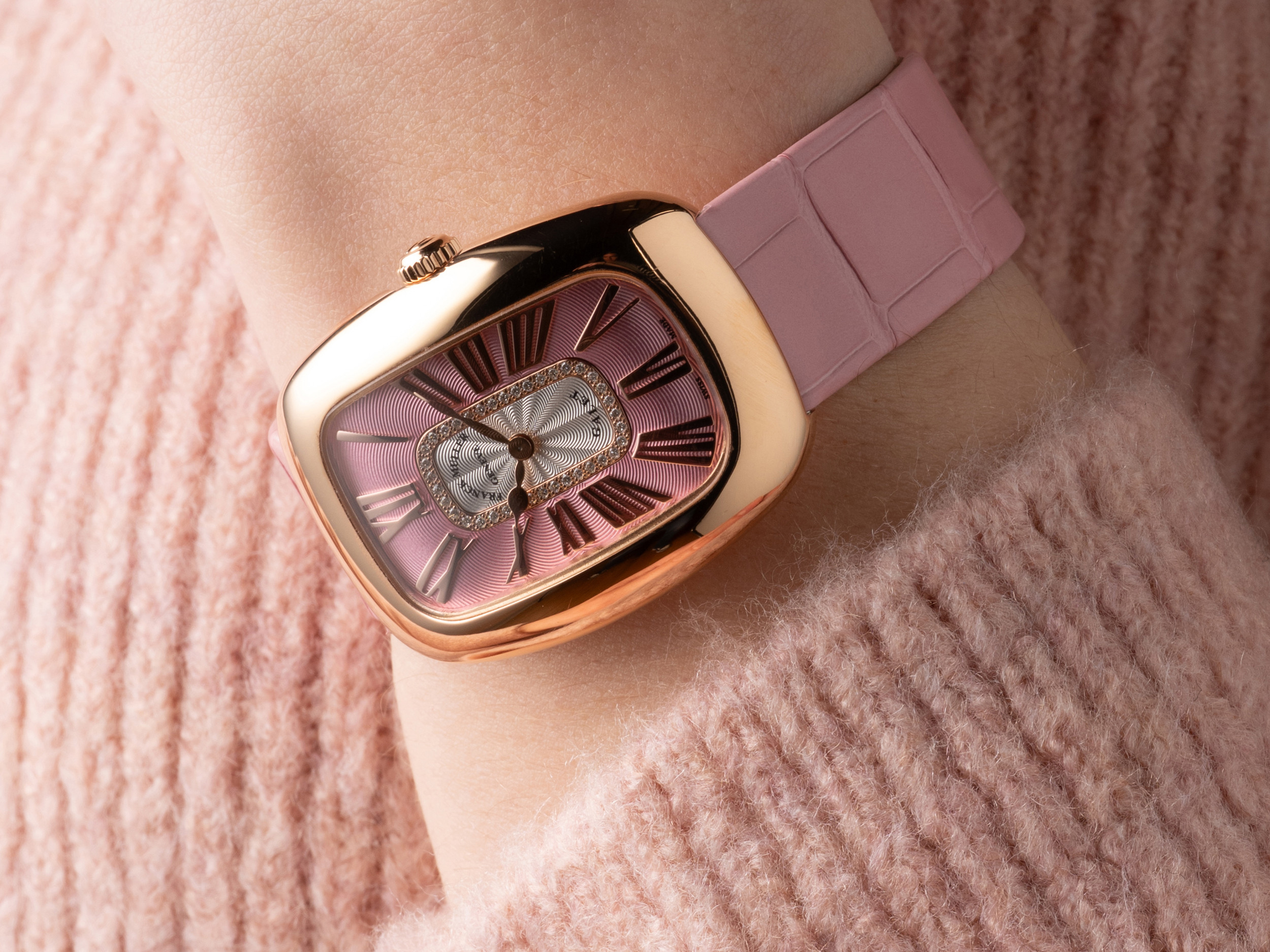 В этой модели нет ничего лишнего: только ставший визитной карточкой Franck Muller корпус-бочонок и циферблат с волнообразным узором гильоше. Последний лаконично украшен россыпью звезд, которые сияют в пространстве между фирменными арабскими цифрами. К корпусу, изготовленному из розового золота, подобран классический ремешок из кожи аллигатора.