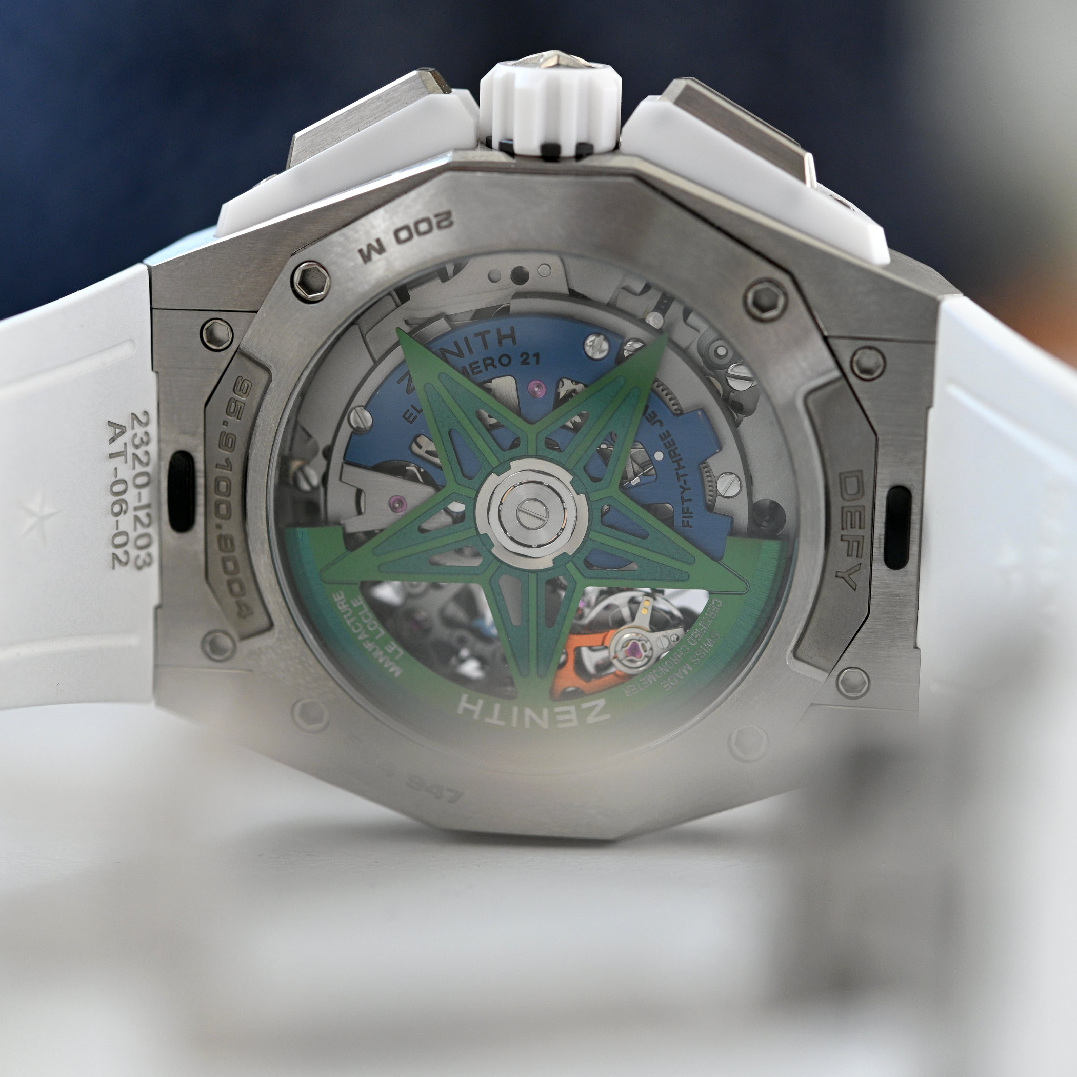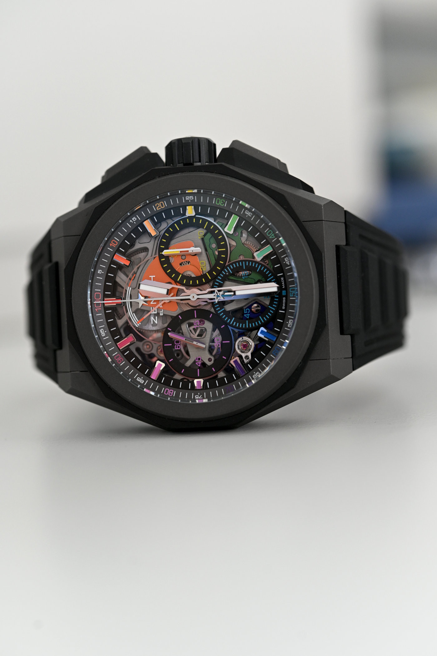 Скелетонизированный циферблат часов открывает вид на многослойную структуру калибра El Primero 9004. Мосты механизма обработаны цветным PVD-покрытием, а покрытые родием часовые метки заполнены «радужным» лаком. Для лучшей читаемости в этом лабиринте цветных деталей покрытые родием стрелки обработаны Super-LumiNova.
