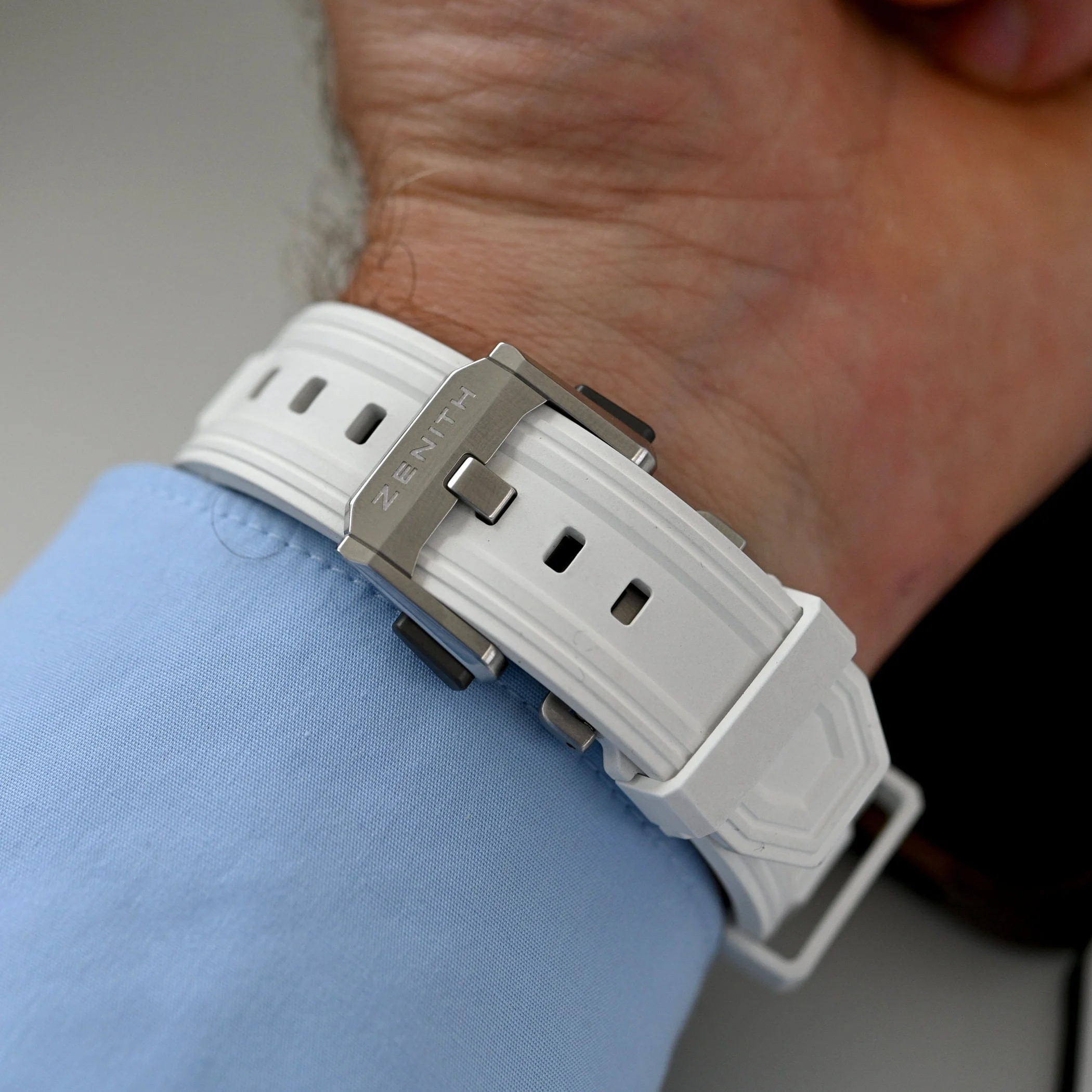 Если предыдущие новинки этой серии отличались корпусами из керамики, то новинки сочетают в себе керамику и титан. Часы получили знакомый поклонникам линейки Defy Extreme многогранный корпус диаметром 45 мм. В одном случае он выполнен из титана с микроструйной обработкой и темным покрытием. В другом – матово-полированный титан сочетается с элементами из белой керамики (безель, заводная головка, защитные накладки для кнопок хронографа). Такое сочетание добавляет часам визуального контраста и делает их удобными для ношения за счет снижения веса.