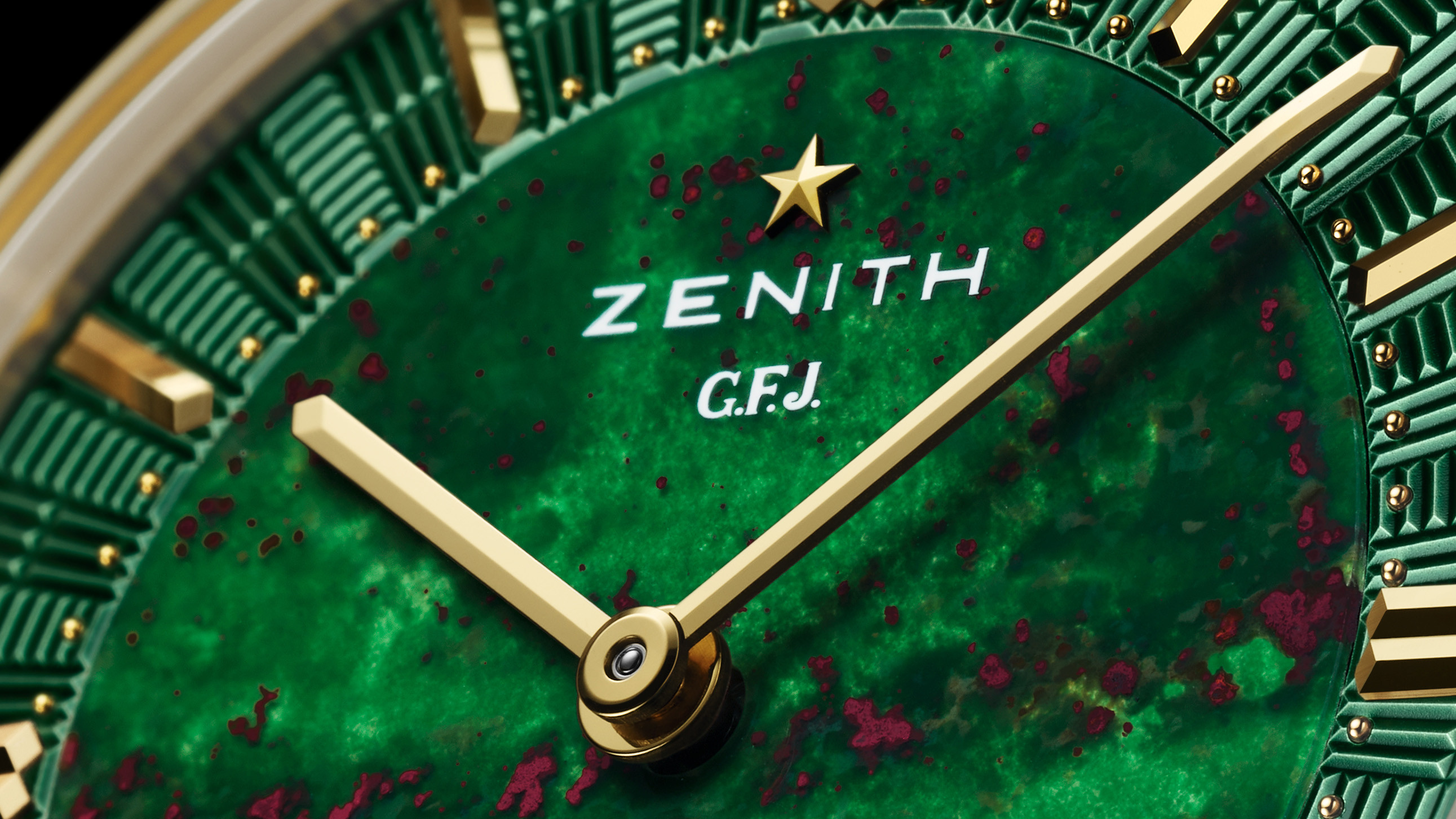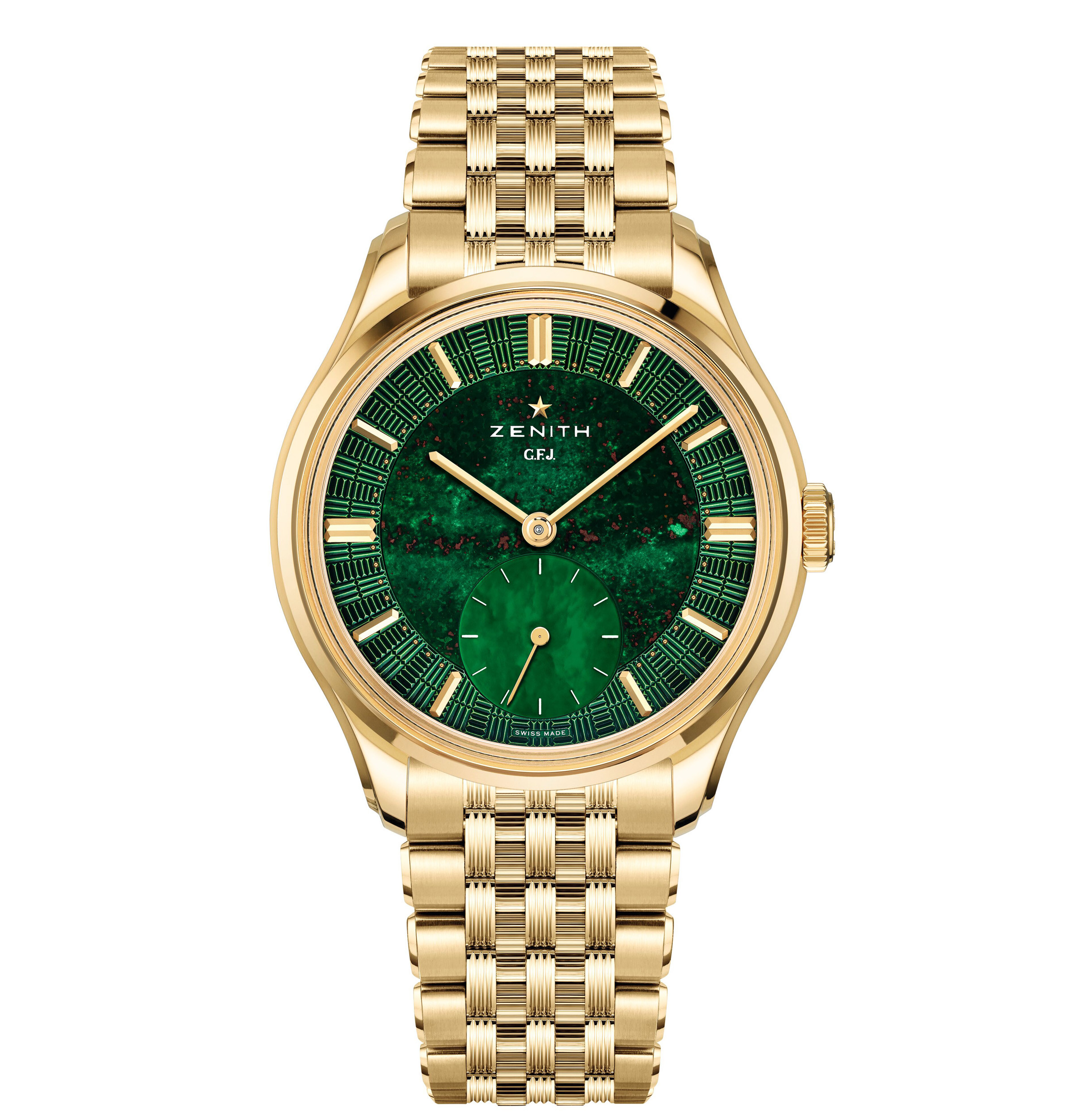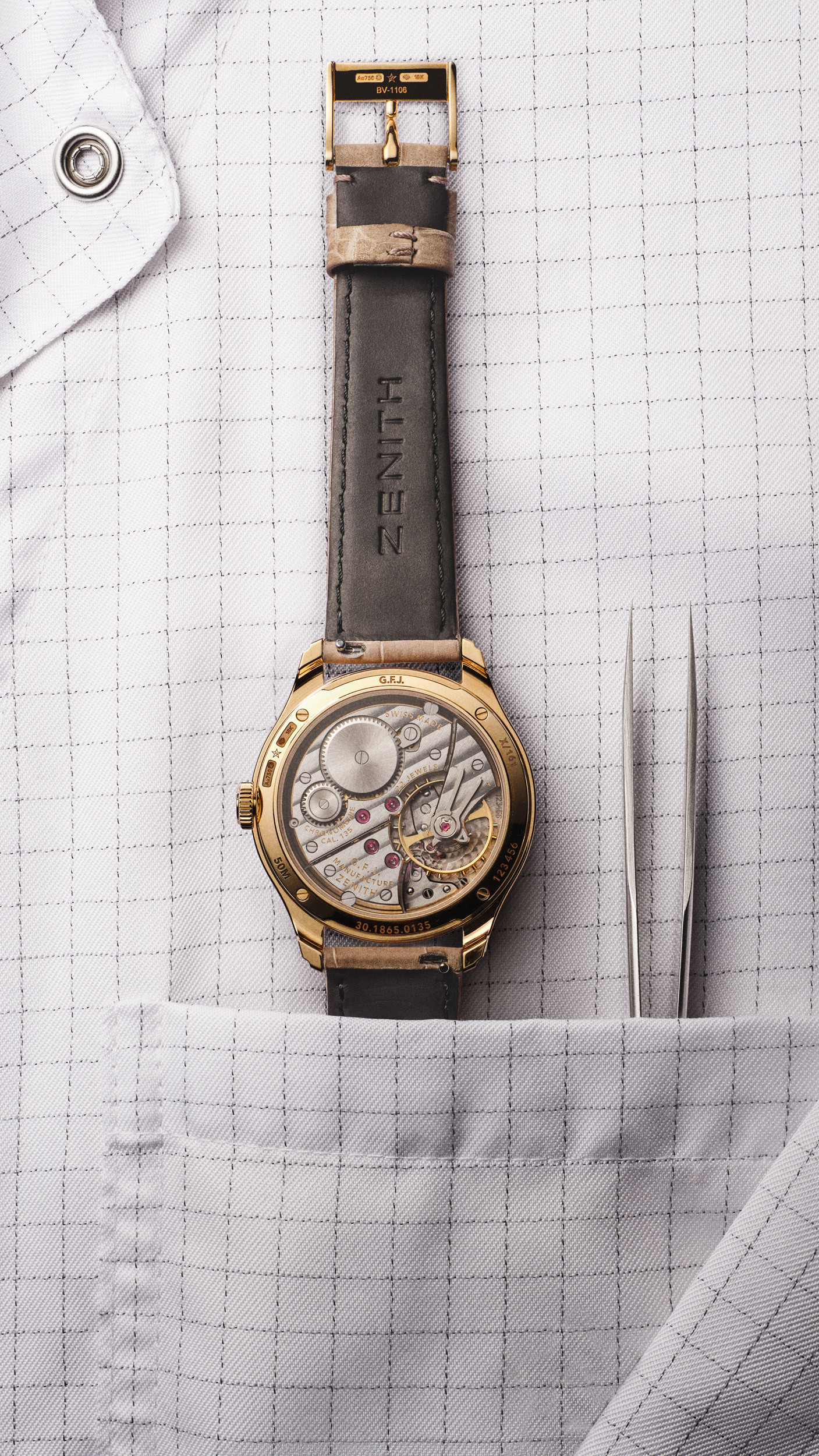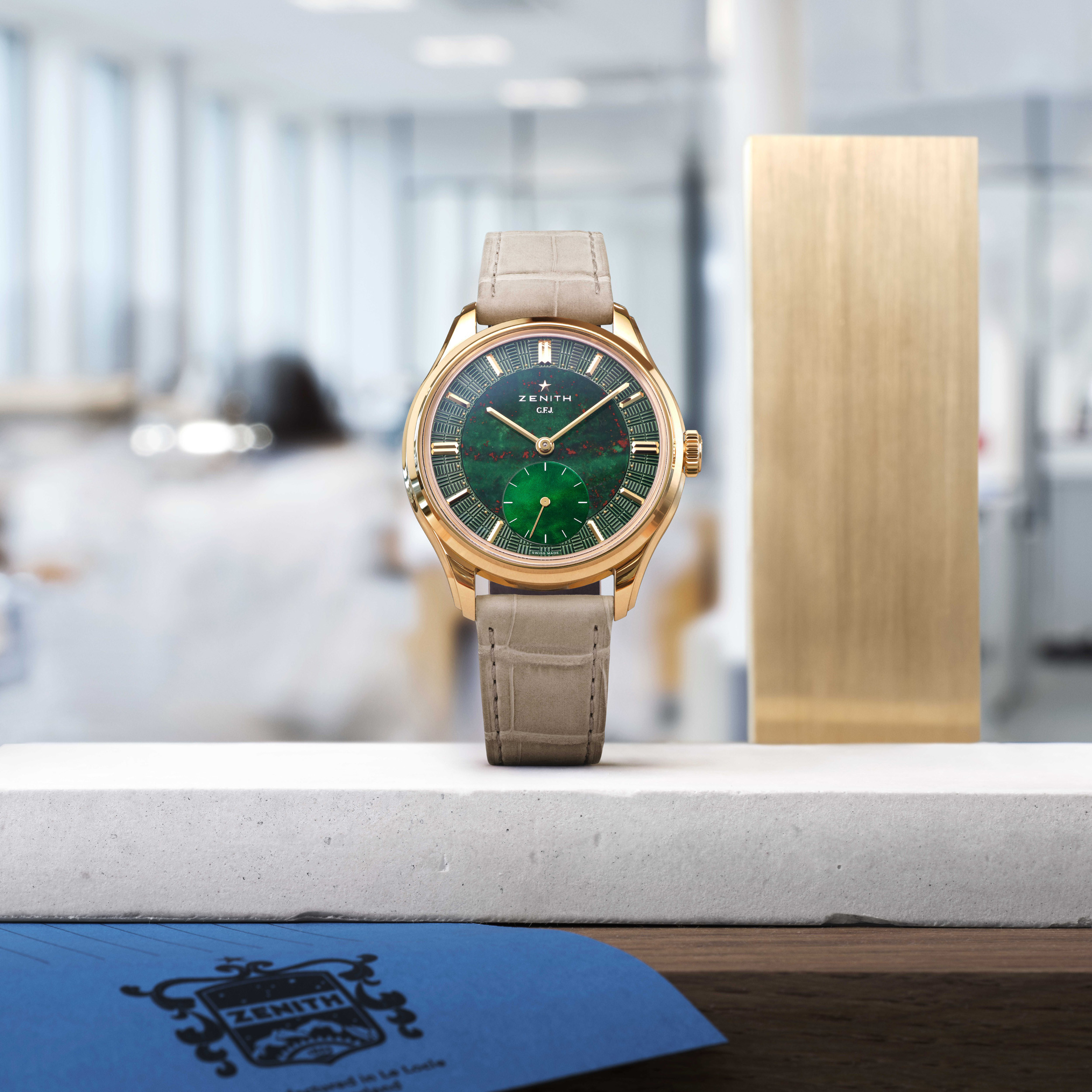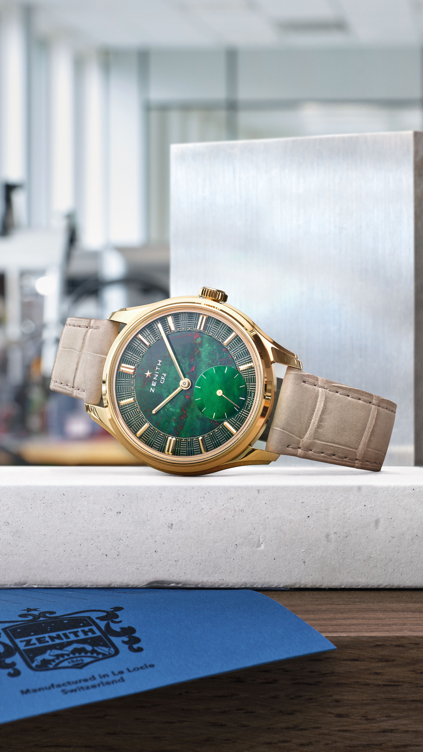 Под сапфировым стеклом хорошо видно циферблат из гематита с характерными прожилками, которые делают каждый экземпляр этой серии уникальным. В нижней части циферблата расположен увеличенный секундный счетчик, изготовленный из перламутра. На периферии циферблата можно увидеть узор гильоше, вдохновленный кирпичным фасадом мануфактуры Zenith в Ле-Локле. Завершают картинку накладные часовые метки из желтого золота, которые перекликаются с тонко ограненными стрелками.